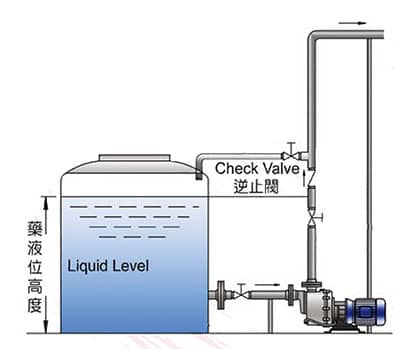 3、當配管高度大于8米時,請于出口加裝逆止閥,逆止閥應高于液位以上,入口管路加大管徑,如泵入口為2“改配2-1/2”入口管,預防吸入量的不足。